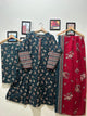 This vibrant three-piece suit features a navy blue base adorned with multicolored floral prints in shades of pink, yellow, and green, perfect for casual and semi-formal occasions. The kurta showcases full sleeves with striped decorative patterns and contrast border detailing that enhances its elegant look. The set includes matching navy floral printed trousers and a complementary dupatta with floral and striped designs. Made from breathable cotton lawn fabric, this outfit offers both comfort and style, making it ideal for daytime wear, social gatherings, and festive events.